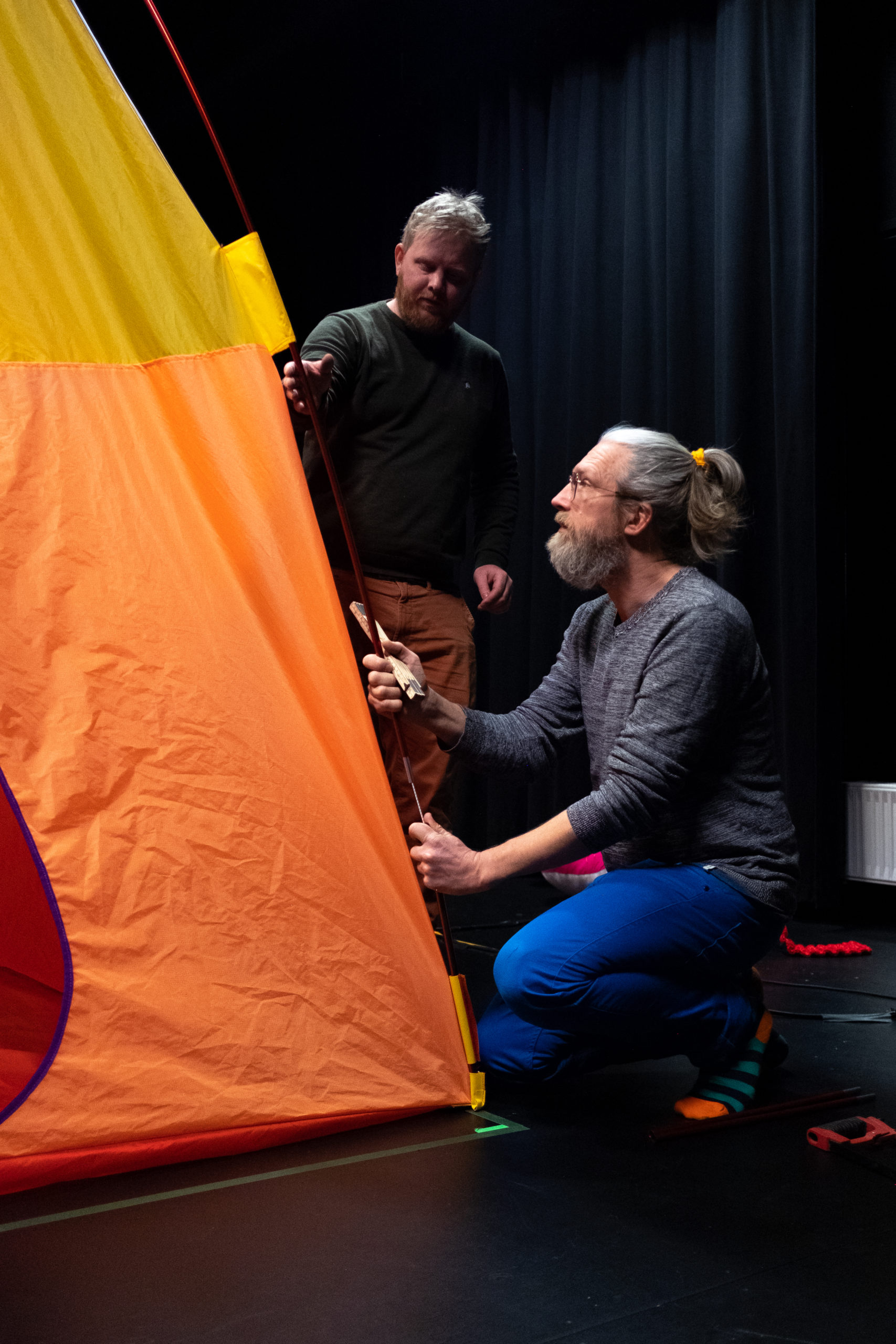 – Det er hele scenografien, sier han og løfter bagen med en arm. – Altså, hele teltet. Jeg skal bare sette det opp, så kommer jeg.